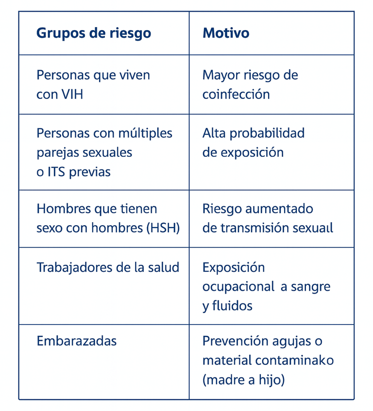 La Organización Mundial de la Salud (OMS) y los CDC recomiendan que toda persona con riesgo de exposición al virus se realice la prueba al menos una vez en la vida.